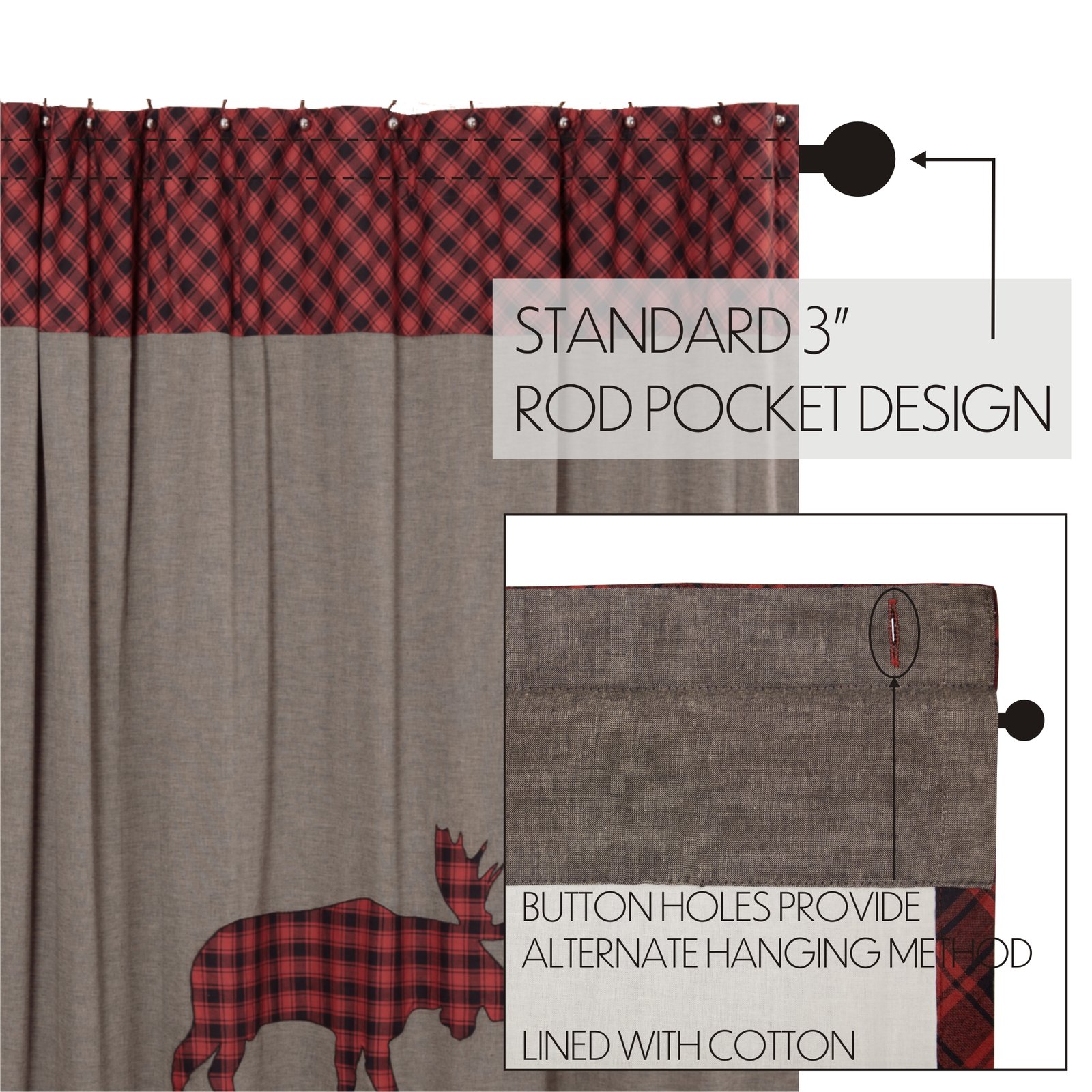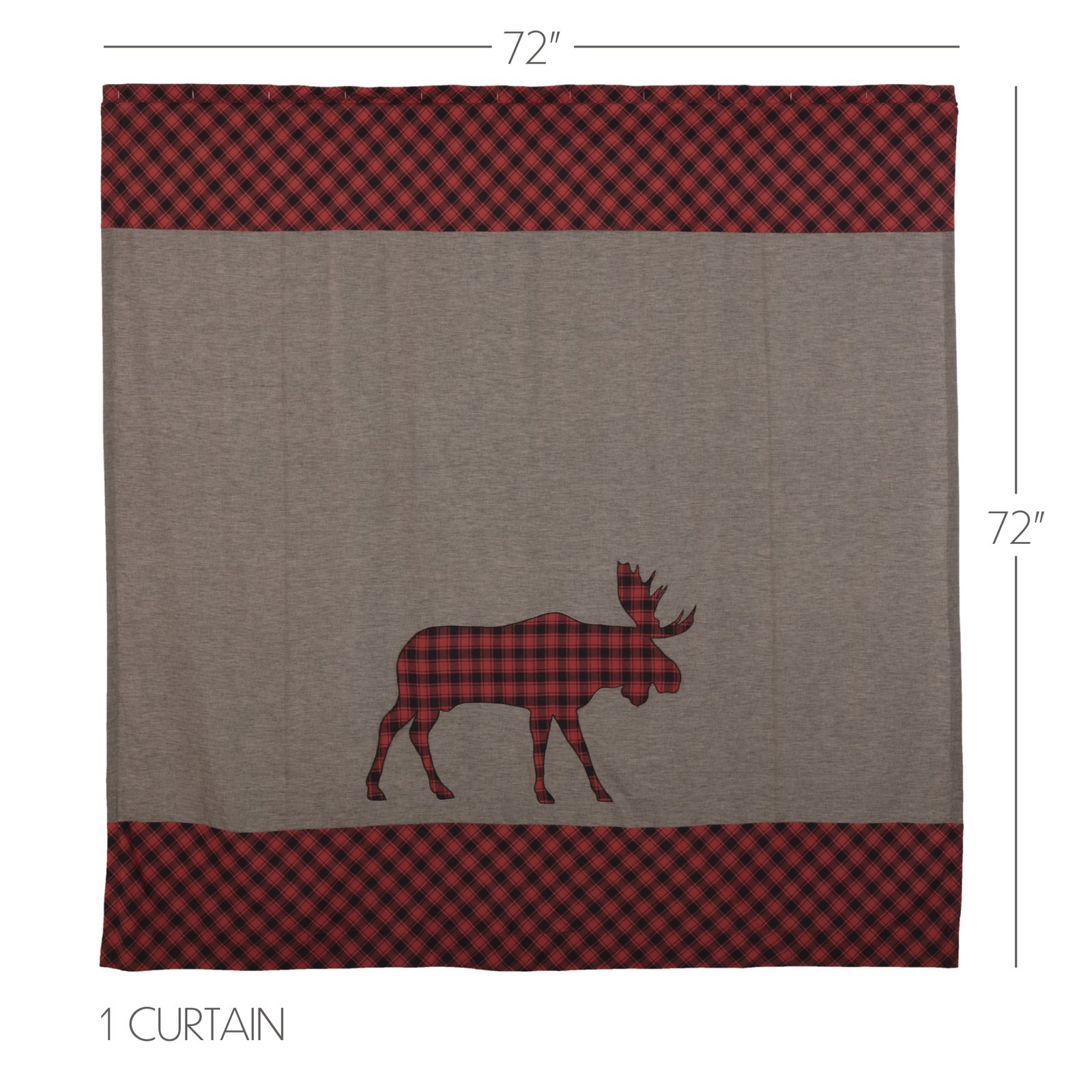 Decorate your bathroom with the perfect blend of simplicity and rustic country charm with the Cumberland Moose Applique Shower Curtain. Featuring a deep grey base with a rustic red and black plaid showcasing a bold moose applique accent, our 72×72 fabric shower curtain provides a rustic country touch to your decor. This machine washable, 100% cotton shower curtain includes button holes for shower hooks and a rod pocket for versatility and convenience.