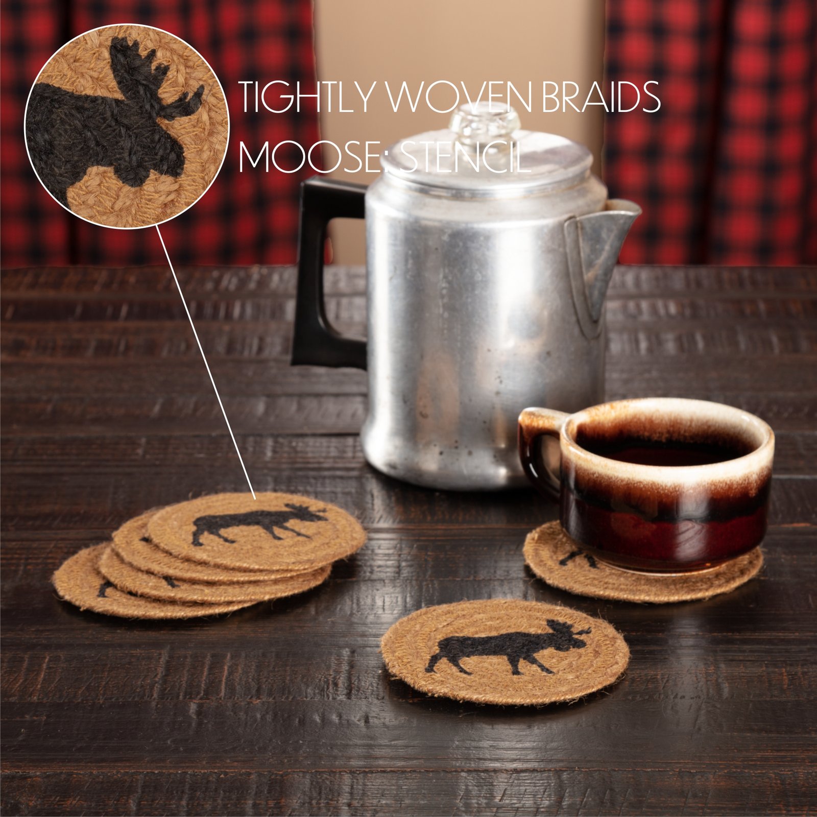 You will receive this premium Cumberland Stenciled Moose Jute Coaster Set of 6 from VHC Brands.