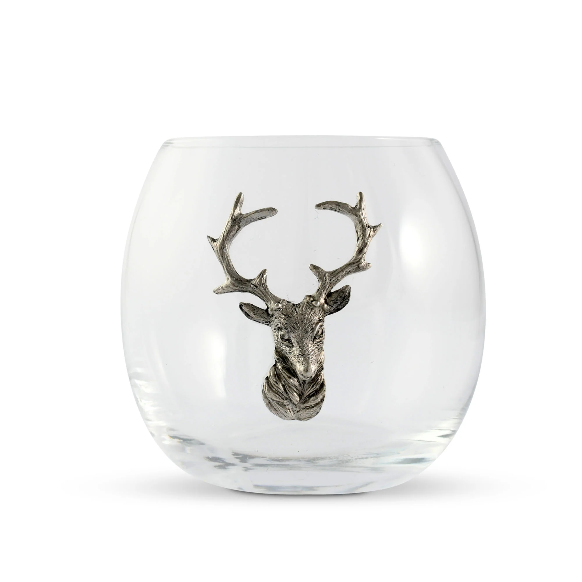 Use this elk / deer stemless wine glass to update wildlife or lodge themes in your mountain cabin or country vacation home. The elegant silvertone animal sits atop the clear glass for added textural appeal and meshes well with existing cottage decor.