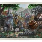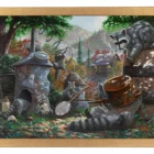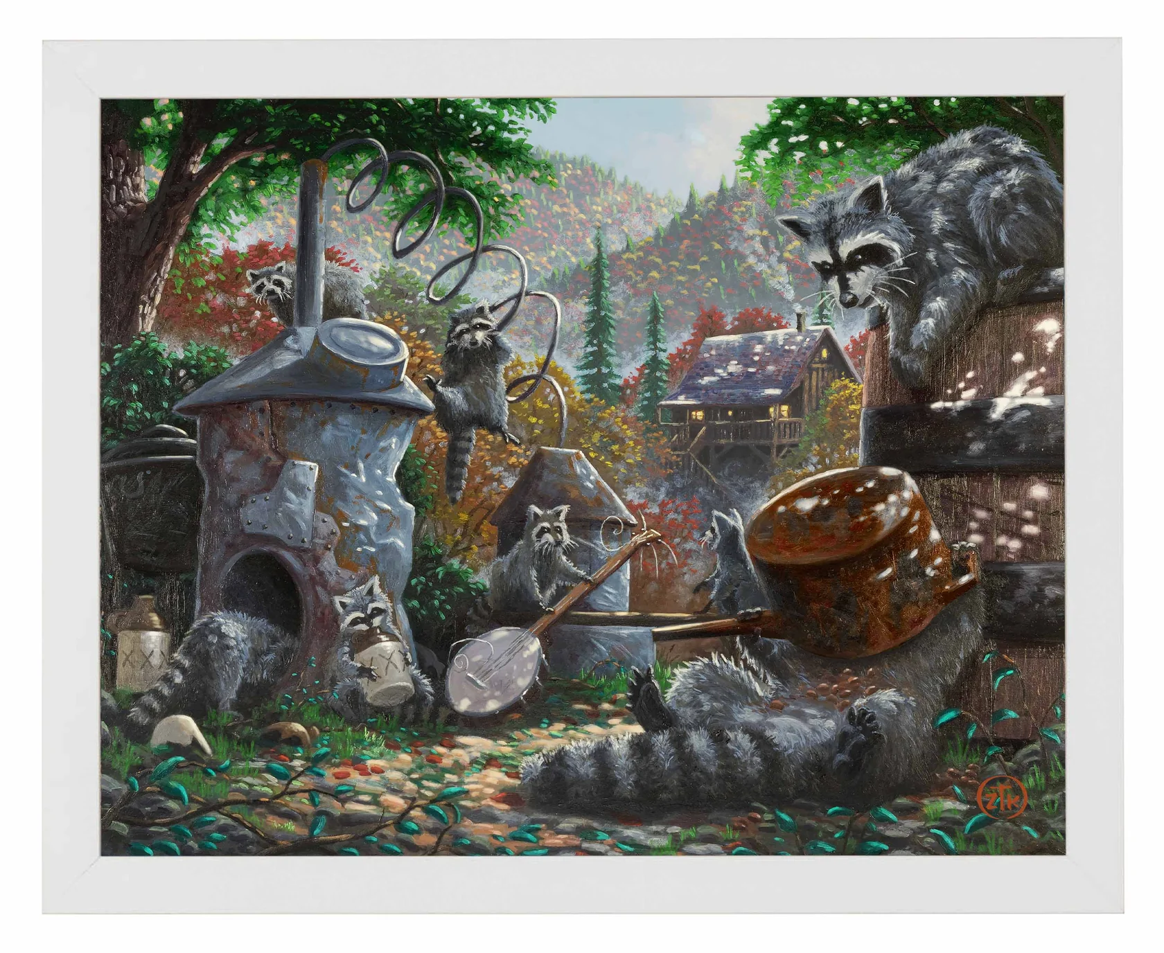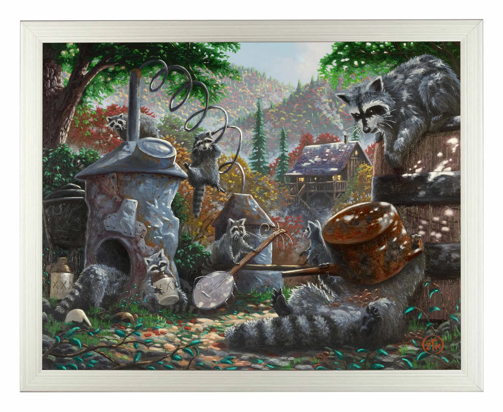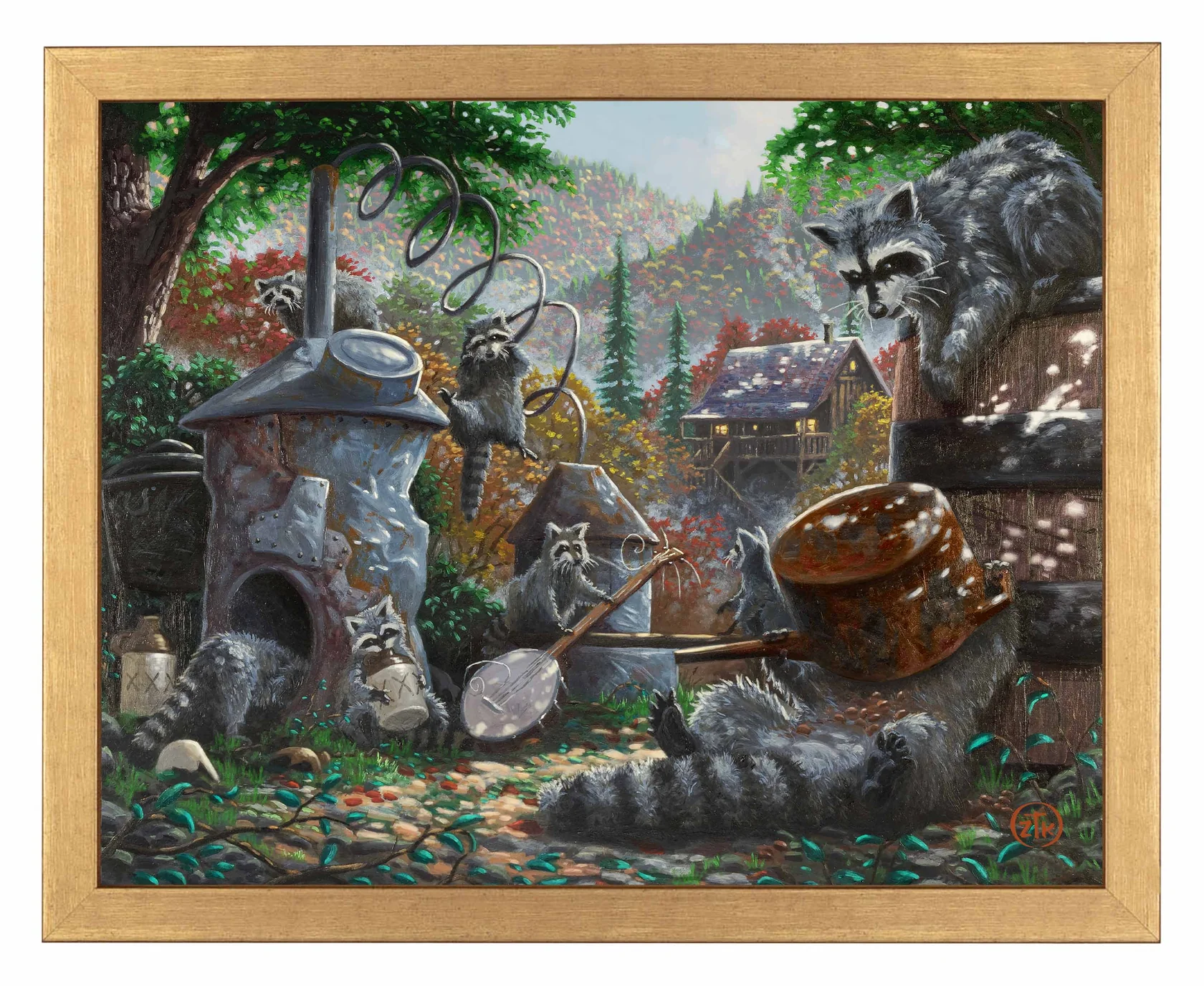 I love the hills and valleys you find in the Ozarks. The grand vistas, the fall colors, and the dappled sunlight as it falls into the hidden forest places all give a sense of adventure and fun to the viewer. You can lose yourself there and feel removed from anything but the wonderment around you. I am also fascinated with mountain life; both the people who live in these “places apart” and the “critters” that share in their existence. “Mountain Mischief” is my vision for this way of being. In it, a gaze of raccoons plays merrily with some old equipment left unattended by the folk of their “hallow”. Whether by starting a “jug band” or by investigating their new-found spoils, this rollicking group is assured to wind up finding trouble from their behavior. I can almost hear the shouts coming from the distant cabin as the ring-tailed “party” is discovered. And, I see the commotion that ensues as the evening shadows swallow this mischievous menagerie scurrying away and leaving a trail of chaos behind. In “Sunlight” or with “Moonshine”, I hope my Ozark Mountain story makes you smile each time you take a moment to visit. And, as always, thank you all for sharing my adventure in art.