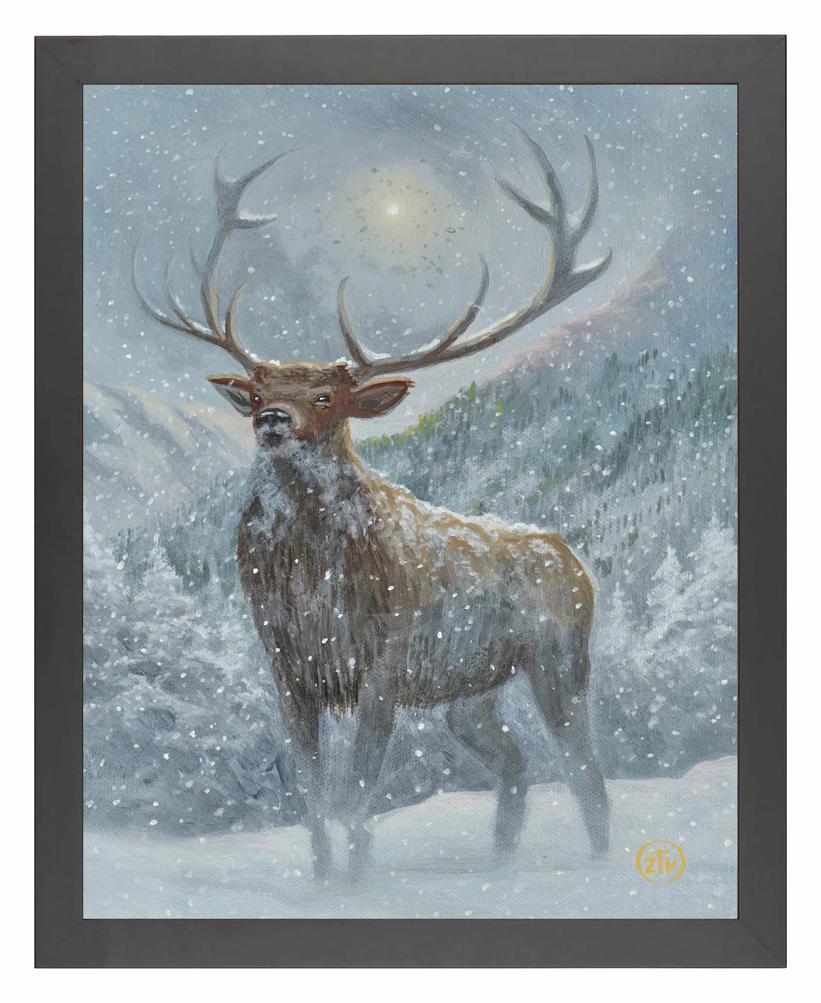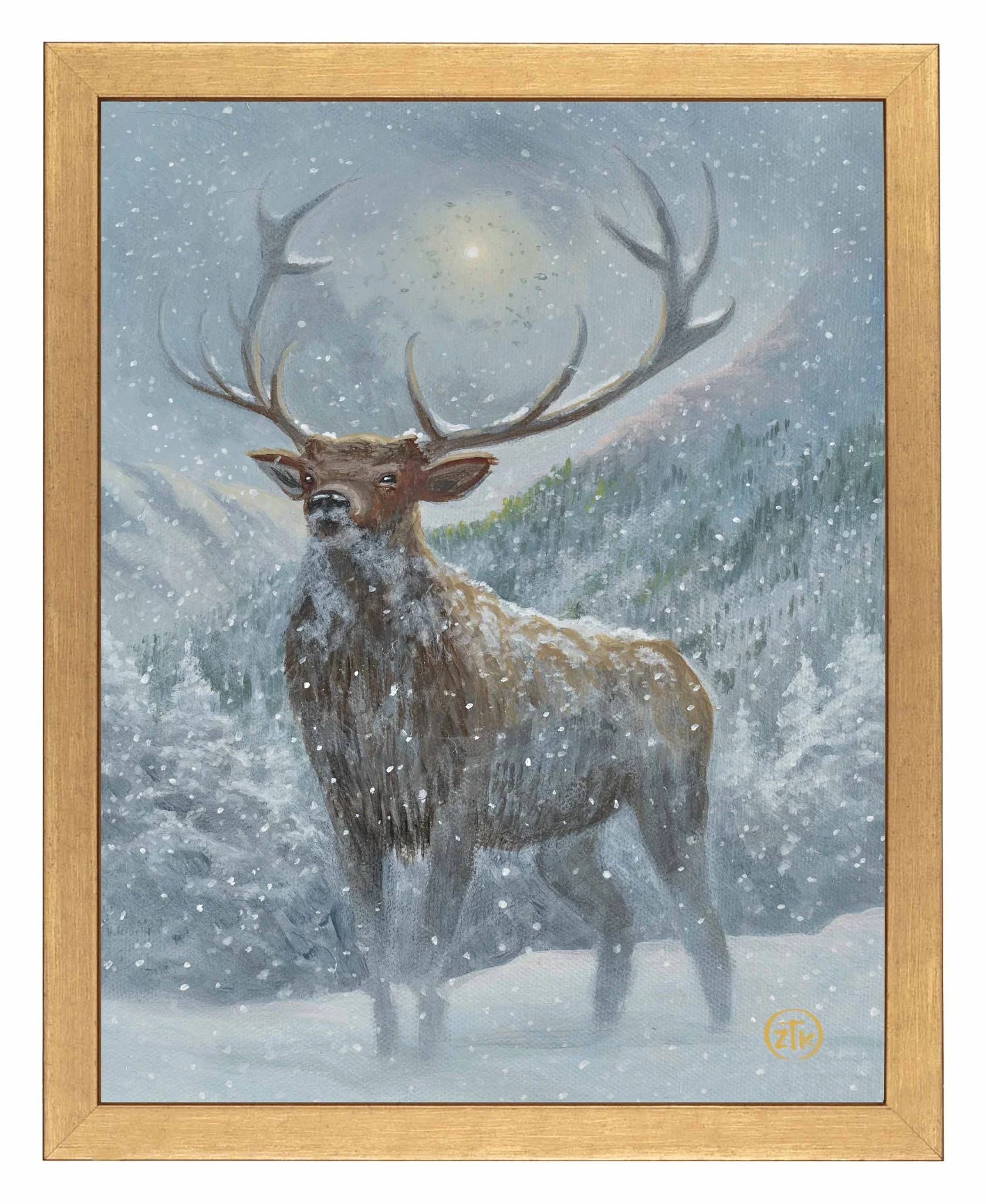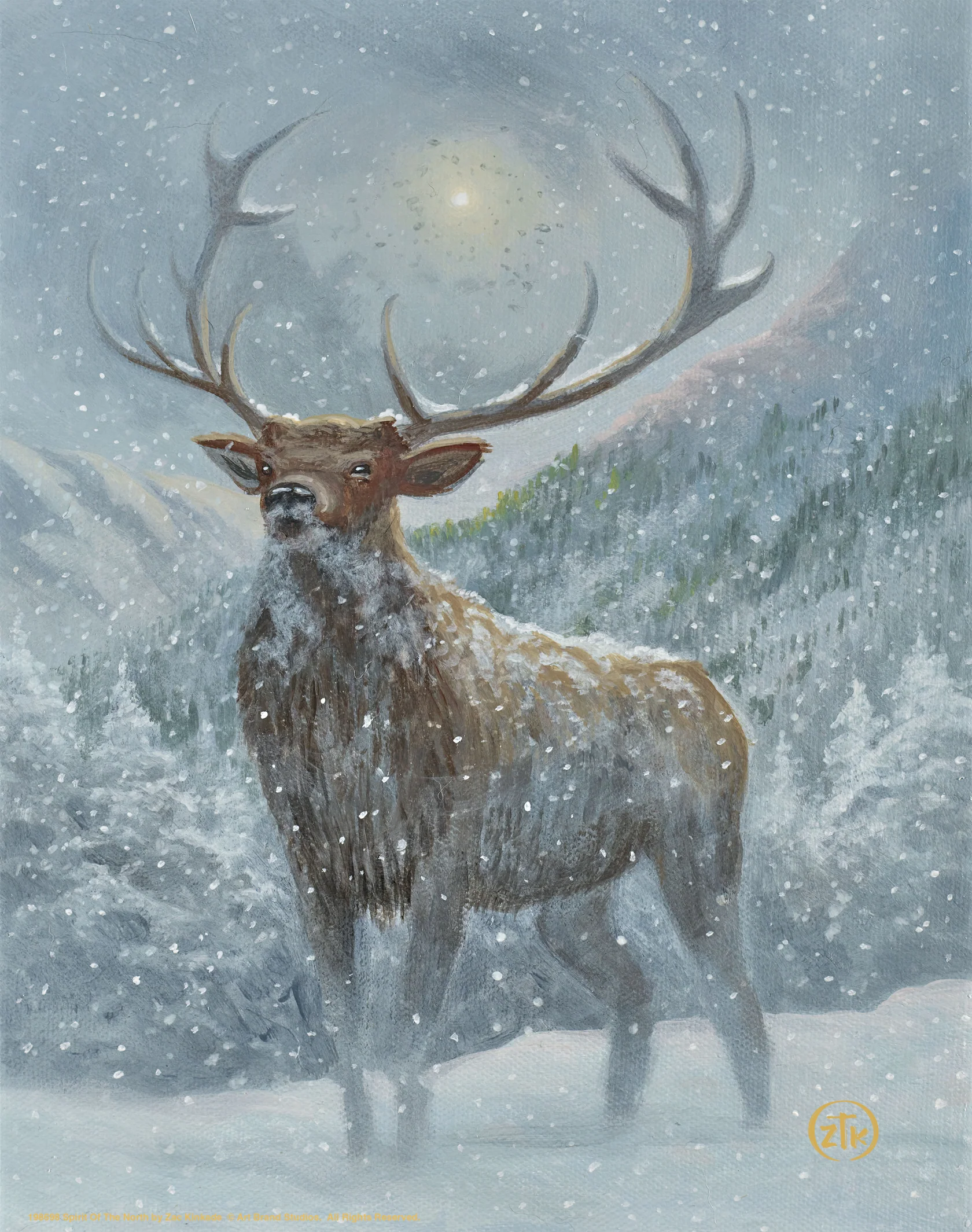 There is a majesty to be seen in this antlered elk. Alone on a snowy ridge, it gazes out into the horizon. It is as if a king were surveying his own kingdom. He wears a rack of bone like a crown to designate his dominion over all that is seen. The sun sits center on this royal headpiece as a jewel would be placed on regalia made by more lowly hands. He lords supreme and has fully embodied Spirit of the North. I have seen such wondrous animals on many of my personal trips to the varied wildlands that still exist. My hope is that the thrill of those encounters translates onto this canvas and that you too feel you have met a monarch. Please enjoy Spirit of the North, and thank you for sharing my adventures in art.