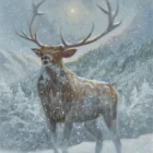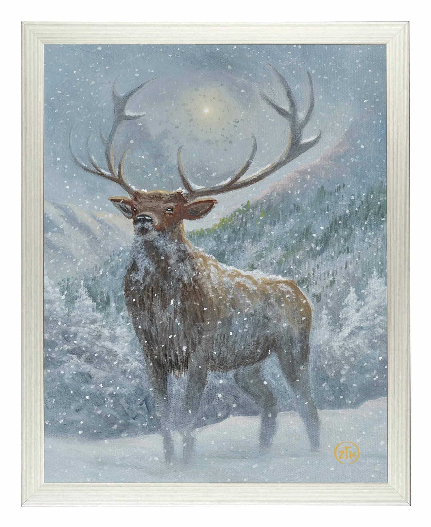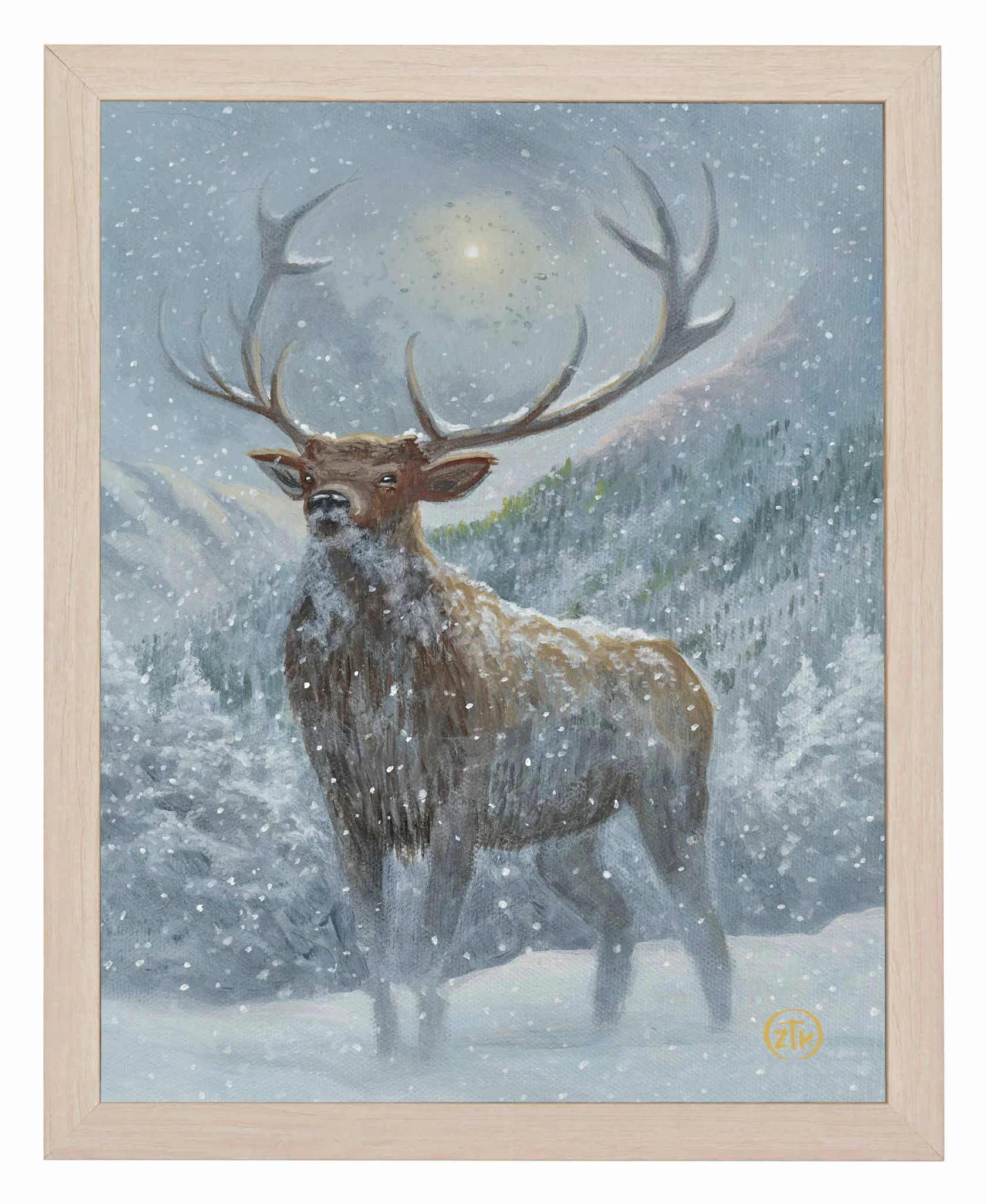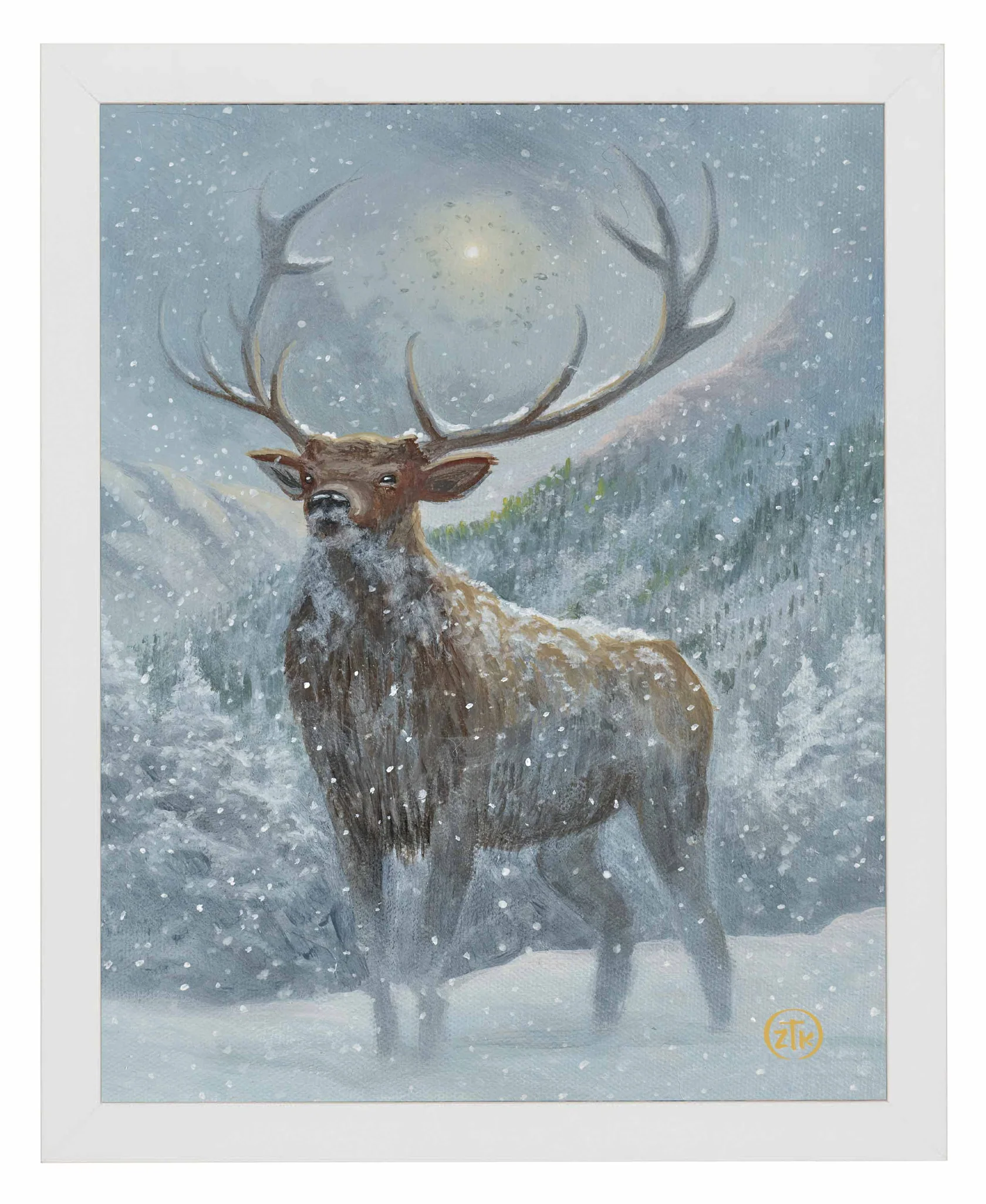There is a majesty to be seen in this antlered elk. Alone on a snowy ridge, it gazes out into the horizon. It is as if a king were surveying his own kingdom. He wears a rack of bone like a crown to designate his dominion over all that is seen. The sun sits center on this royal headpiece as a jewel would be placed on regalia made by more lowly hands. He lords supreme and has fully embodied Spirit of the North. I have seen such wondrous animals on many of my personal trips to the varied wildlands that still exist. My hope is that the thrill of those encounters translates onto this canvas and that you too feel you have met a monarch. Please enjoy Spirit of the North, and thank you for sharing my adventures in art.