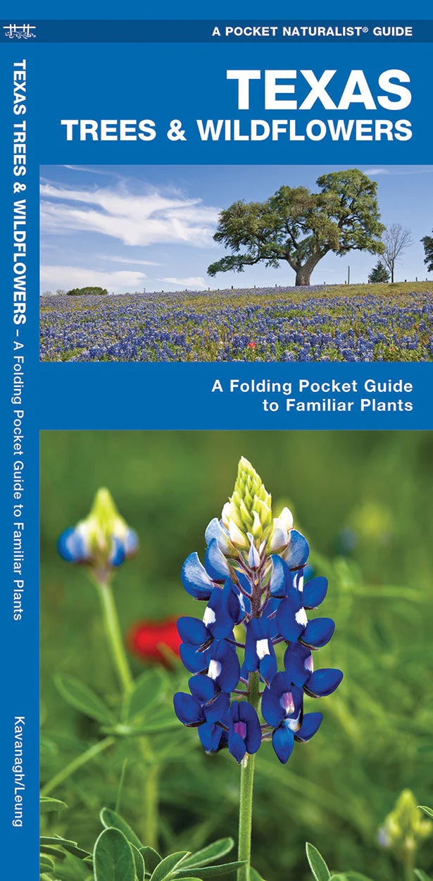 The state flower, the Texas bluebonnet, is one of thousands of species of plants growing in the diverse ecosystems found throughout Texas, a place that harbors the second highest number of state wildflower species in the nation. This beautifully illustrated guide highlights over 140 familiar and unique species of trees, shrubs and wildflowers and also includes an ecoregion map featuring prominent botanical sanctuaries. Laminated for durability, this lightweight, pocket-sized folding guide is an excellent source of portable information and ideal for field use by visitors and residents alike. Made in the USA.