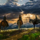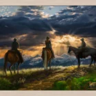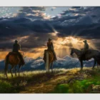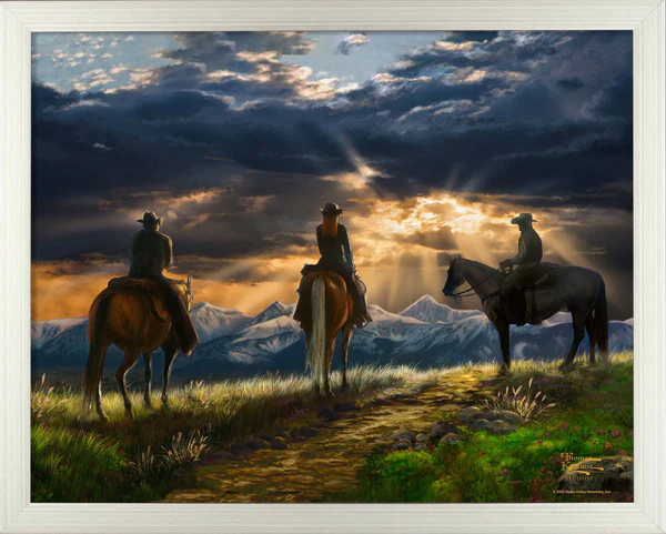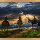 Under the Big Sky, a striking piece from the Yellowstone television series collection, captures the essence of Montana’s raw beauty and the solitary grandeur of ranch life. Three riders are silhouetted against a spectacular sunset, where the sky erupts in brilliant oranges and purples above the snow-capped peaks of Paradise Valley. The painting portrays a moment of quiet contemplation as these guardians of the Dutton legacy survey their ancestral lands from horseback, while wildflowers dot the sage-covered hillside beneath them. The artist masterfully renders the interplay of fading sunlight and gathering dusk, embodying the show’s themes of legacy, loyalty, and the enduring connection between the ranchers and the majestic landscape they’ve sworn to protect.