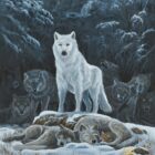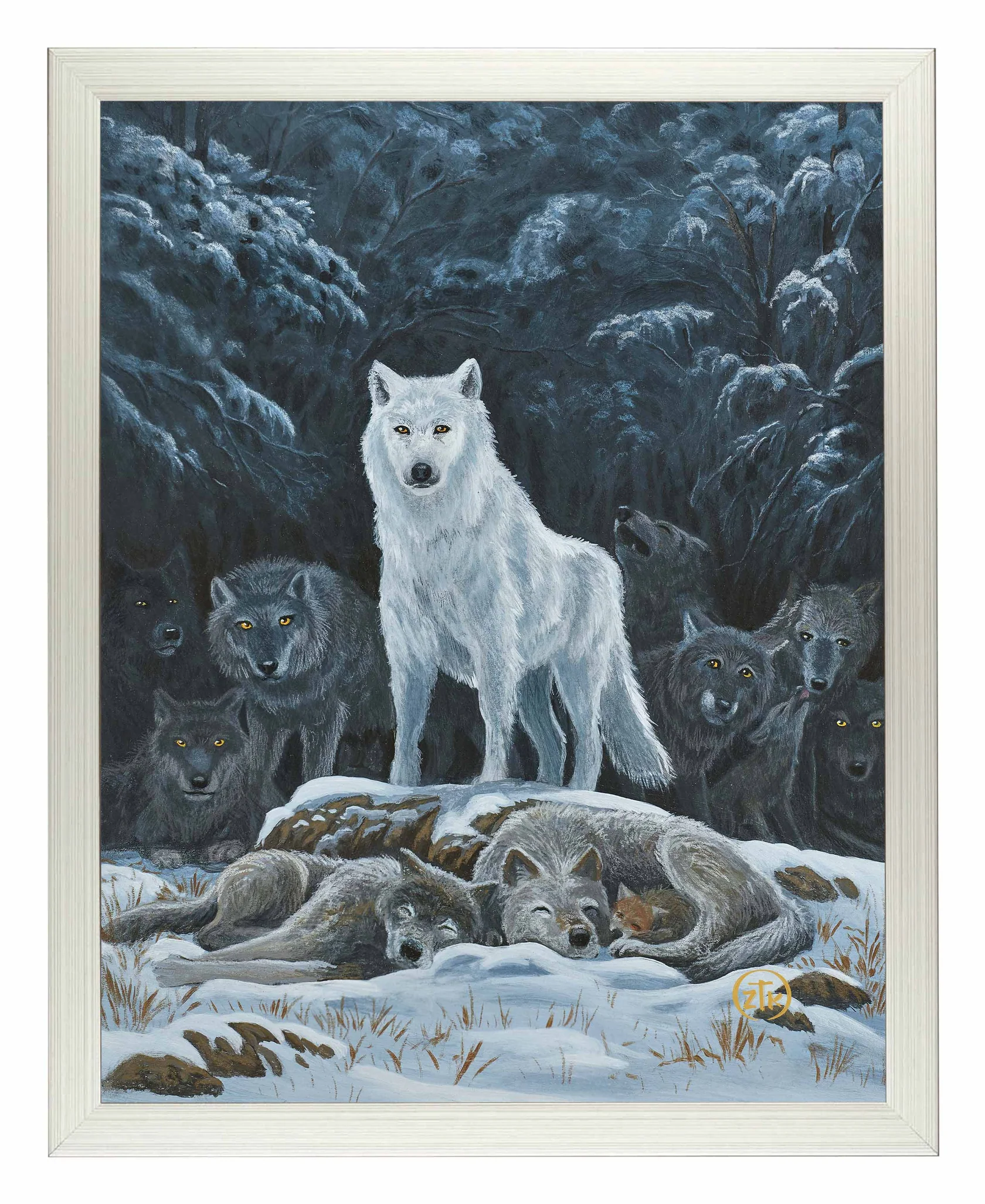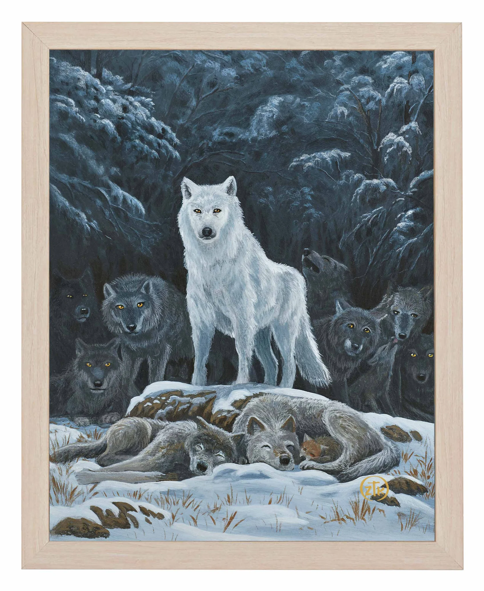 Unleash the power of the wild with this captivating “Winter Guard – Wolves” art print from Wild Wings.