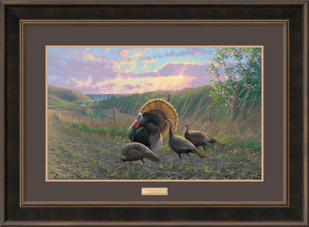 Celebrate the wild, unmistakable beauty of North America’s turkeys with Michael Sieve’s “Golden Fan Club”, a limited-edition print that captures the regal posture and autumn-warm glow of these iconic birds. Known for his lifelike detail and deep respect for wildlife, Sieve brings the scene to life with rich color, layered texture, and a quietly powerful composition that draws the viewer in.
