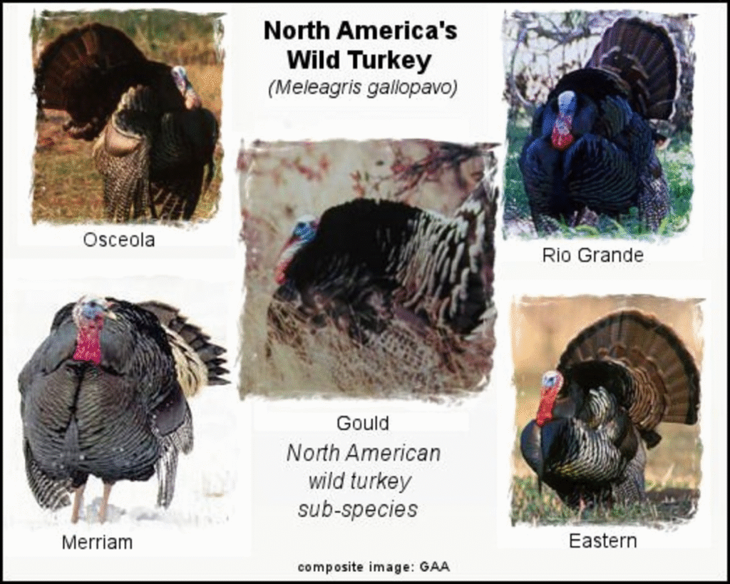 There are five recognized subspecies of wild turkeys in North America, each adapted to its own region: